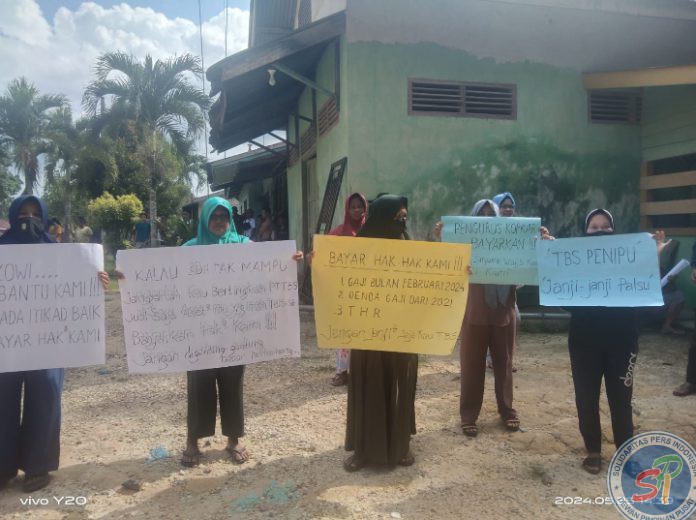 Mantan karyawan PT. TBS dari kaum perempuan mendatangi kantor PT TBS yang berada di K.i.5, Desa muara petai, Adapun tujuan kedatangan dari karyawan PT.TBS tersebut yakni, untuk menuntut pembayaran hak-hak mereka yang hingga hari ini belum diselesaikan oleh pihak PT TBS.