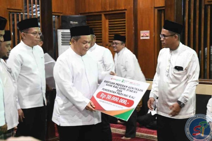 Adapun bantuan yang diserahkan Plt Gubri saat itu yakni bantuan program kemitraan Pemprov Riau dan BRK Syariah senilai Rp30 juta dan 150 paket kain pelikat. Bantuan tersebut diserahkan Plt Gubri langsung kepada pengurus masjid setempat.